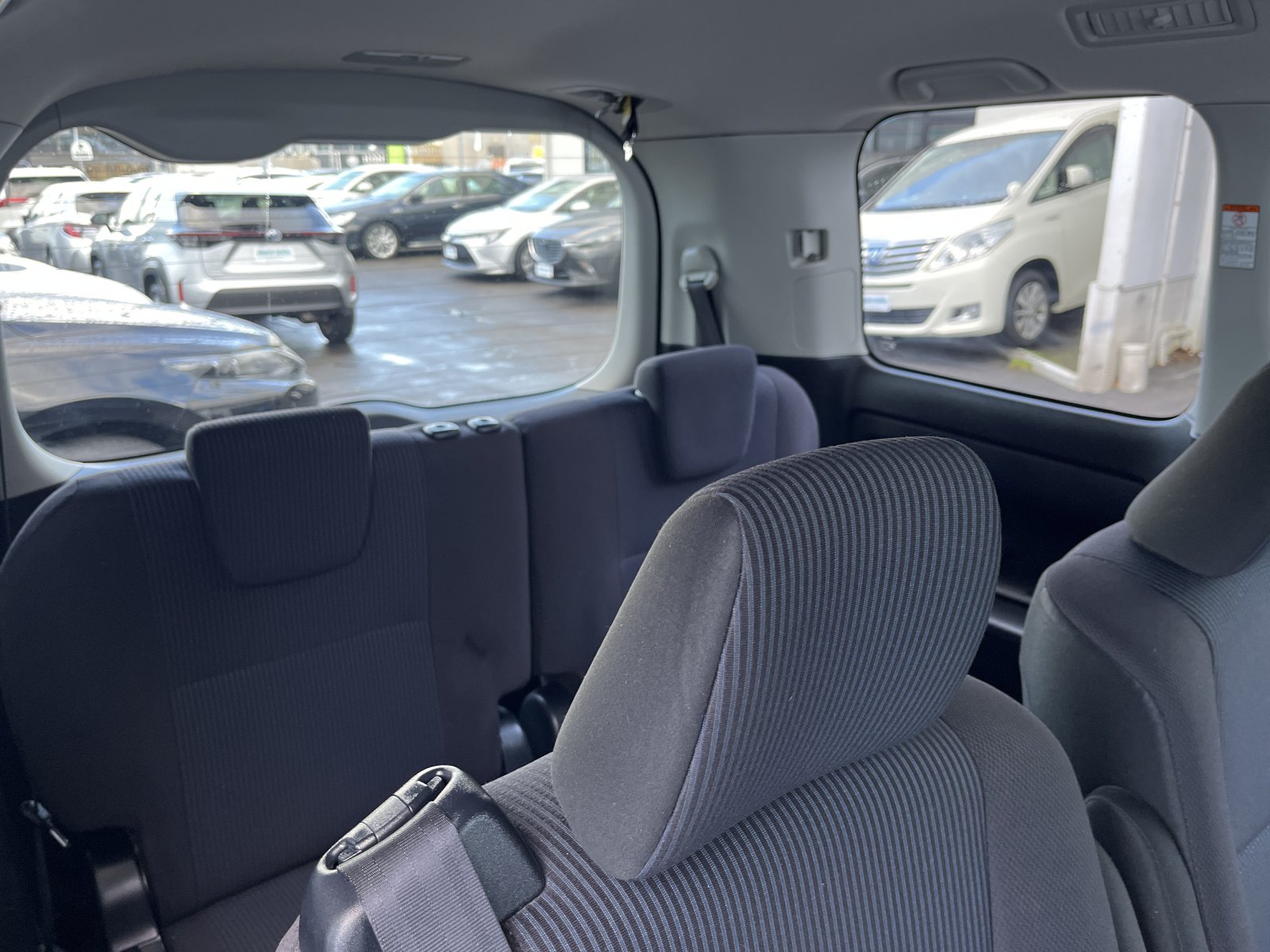 The Toyota Noah / Voxy can easily accommodate 7 full-sized adults and their luggage. In the first row, the driver and passenger are afforded good legroom and a good view of the road. Both seats are manually or electrically adjustable and even tall people have sufficient legroom. The second and third rows have good legroom as well, with excellent shoulder space.